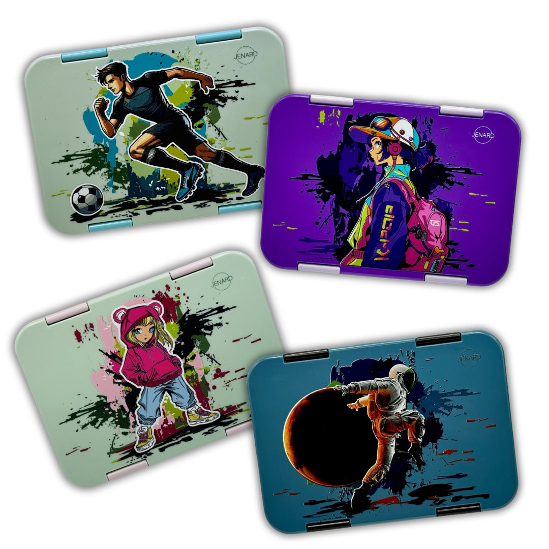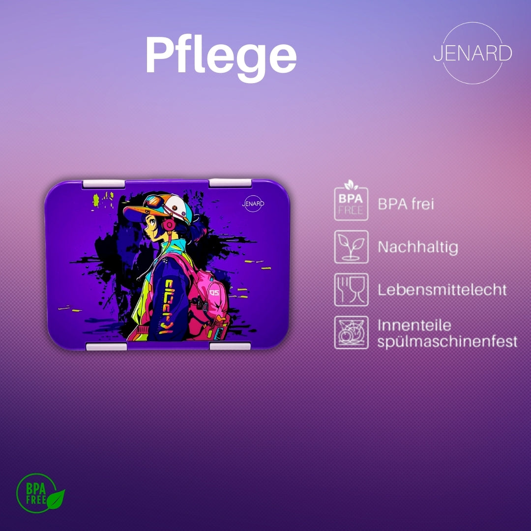 Jenard Brotdose für Kinder mit Fächern. Sehr robuste, flexible und praktische Lunchbox, ideal für die Schule. Coole Bentobox in Lila / Anime